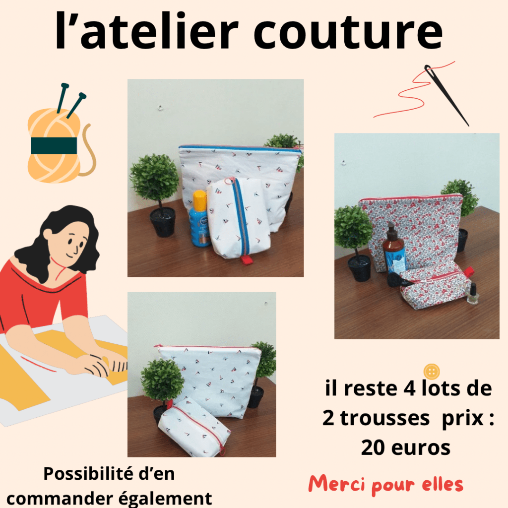 L’atelier couture remet en vente 4 lots de 2 trousses ( une grande et une petite ) prix : 20 euros .